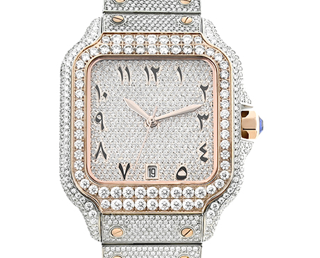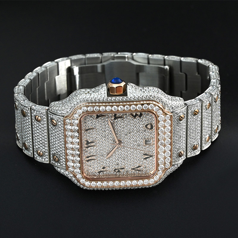 Fully moissanite diamond on dial, arabic numberals.